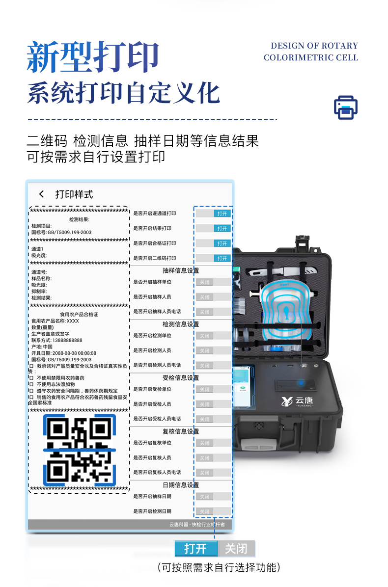 7、圖像調(diào)整功能:可根據(jù)金標(biāo)卡讀取圖像進(jìn)行多方位調(diào)整,使其更精準(zhǔn)讀取結(jié)果。 | 8、儀器檢測系統(tǒng)擁有龐大數(shù)據(jù)庫,并且構(gòu)建了完善的檢索、修訂功能。食品庫涵蓋多種樣品名稱,可按需添加或刪除、編輯樣品名稱;產(chǎn)品數(shù)據(jù)庫以及歷史檢測記錄支持一鍵檢索功能。 | 9、系統(tǒng)打印自定義化,打印格式多樣化,產(chǎn)品合格證(國家標(biāo)準(zhǔn)要求),二維碼,抽樣信息、檢測信息,受檢信息、復(fù)核信息、抽樣日期、檢測日期等信息結(jié)果,可按需求自行設(shè)置打印內(nèi)容。 | 10、A4紙版本報告打印功能:設(shè)備擁有兩種結(jié)果展示方式,可以自動生成A4打印模板和小票打印模板兩種樣式,可通過WiFi及網(wǎng)線等方式鏈接外置打印機(jī)可進(jìn)行打印 | 11、儀器具有 wifi 聯(lián)網(wǎng)上傳、RJ45網(wǎng)線連接功能,可以快速上傳數(shù)據(jù)。同步對接監(jiān)管平臺,數(shù)據(jù)可局域網(wǎng)和互聯(lián)網(wǎng)數(shù)據(jù)上傳,檢測結(jié)果直接傳至食品安全監(jiān)管平臺。進(jìn)行區(qū)域食品安全監(jiān)管及大數(shù)據(jù)分析處理與數(shù)據(jù)統(tǒng)計,檢測區(qū)域食品安全長短期動態(tài),達(dá)到食品安全問題預(yù)估、預(yù)警。 | 12、設(shè)備支持U盤存儲,標(biāo)準(zhǔn)USB接口,免驅(qū)動安裝。檢測結(jié)果存儲容量20萬條以上,可生成Excel表格,進(jìn)行一鍵拷貝,并具有登錄保護(hù)功能,可設(shè)置用戶名及密碼,規(guī)范不同人員操作權(quán)限,防止非工作人員操作,并且可以進(jìn)行重新校準(zhǔn)、鎖定、恢復(fù)出廠設(shè)置功能。儀器固件可升級,后期檢測項目可擴(kuò)充。 | 13、儀器具備遠(yuǎn)程升級功能,可定向分客戶分儀器更新,開機(jī)后自動更新,并可持續(xù)性免費(fèi)更新系統(tǒng)版本,無需像傳統(tǒng)產(chǎn)品返廠更新,節(jié)省時間及人力成本并避免了物流運(yùn)輸返廠升級導(dǎo)致設(shè)備損壞的潛在風(fēng)險。 |