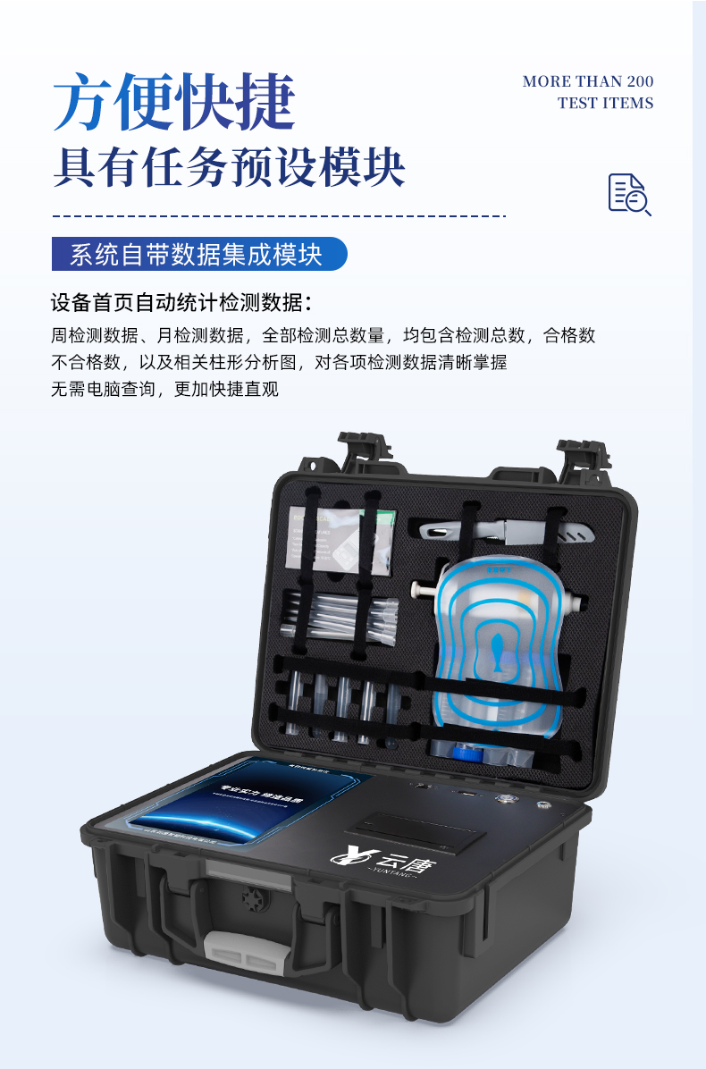 | 1、儀器采用10.1英寸液晶觸摸屏顯,搭配運(yùn)行安卓智能操作系統(tǒng),主控芯片采用ARM Cortex-A7,RK3288/4核處理器,主頻1.88Ghz,運(yùn)轉(zhuǎn)速度更快速,性能更強(qiáng)。 | 2、儀器功能包括:膠體金檢測模塊、數(shù)字化管理模塊、無線通訊模塊等,可以滿足同一軟件下實現(xiàn)所有檢測項目的檢測,并在同一窗口展示檢測結(jié)果。 | 3、一體化便攜式快檢設(shè)備,采用交直流兩用供電方式,可連接車載電源,配備6ah大容量充電鋰電池,可以滿足現(xiàn)場及流動檢測使用的需求。儀器尺寸:43×35×20cm, 主機(jī)凈重:5.1kg | 4、系統(tǒng)自帶數(shù)據(jù)集成模塊,設(shè)備首頁自動統(tǒng)計檢測數(shù)據(jù)包含:周檢測數(shù)據(jù)、月檢測數(shù)據(jù),全部檢測總數(shù)量,均包含檢測總數(shù),合格數(shù),不合格數(shù),以及相關(guān)柱形分析圖,對各項檢測數(shù)據(jù)清晰掌握,無需電腦查詢,更加快捷直觀。 | 5、儀器具有任務(wù)預(yù)設(shè)模塊,可在樣品送檢前提前預(yù)設(shè)樣品名稱、檢測指標(biāo)、送檢單位等信息,樣品送檢時一鍵調(diào)取保存信息,檢測更加方便快捷。 |
