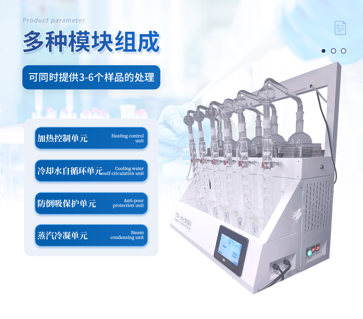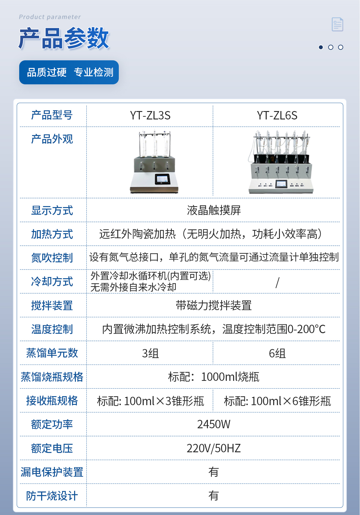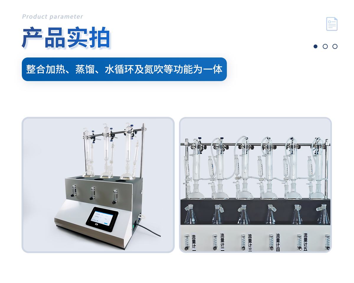 主要原理是根據藥典中所提供的檢測方法,將中藥材以蒸餾法進行處理,樣品中的亞硫酸鹽系列物質加酸處理后轉化為二氧化硫后,隨氮氣流帶入到含有雙氧水的吸收瓶中,雙氧水將其氧化為硫酸根離子,采用酸堿滴定法測定,計算藥材及飲片中的二氧化硫殘留量。本產品在嚴格遵循藥典要求的基礎上,整合加熱,蒸餾,水循環及氮吹等功能為一體,可同時提供3-6個樣品(空白樣,平行樣)的處理,從而極大的提高了檢測數據的精度和減少了工作時間。