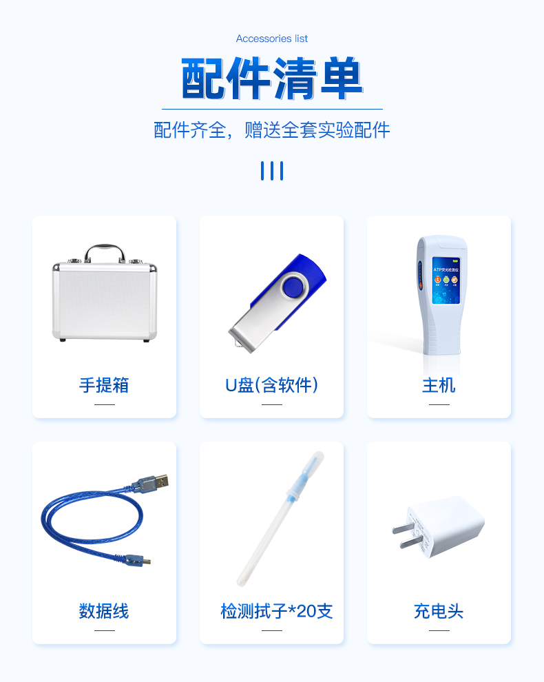 隨機配置:ATP熒光檢測儀(手持)主機、鋁合金手提箱、驅動U盤、儀器包、掛繩、PC數據線、數據分析軟件、中文操作手冊