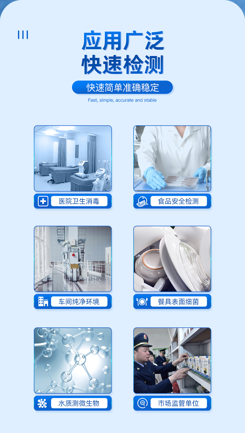 云唐ATP熒光檢測儀廣泛應用于:細菌微生物檢測、醫藥衛生、食品安全、市場執法、表面潔凈度檢測、醫療防疫、水質水政、生產線衛生、工業水處理、環保檢測、海關出入境檢疫及其他執法部門等多種行業。