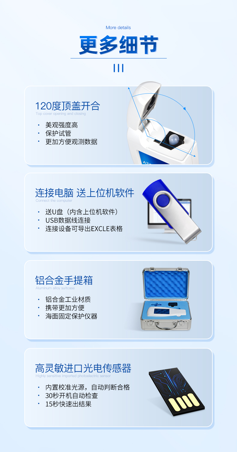 體驗更好 —— 試子套管采用插拔式靈活設計,可定期清洗長期使用,延長儀器壽命。