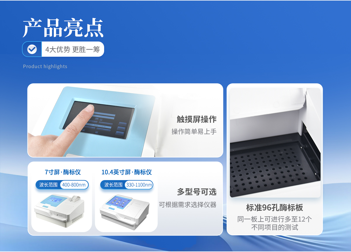 酶標儀是酶聯免疫吸附實驗的專用儀器,基于固定波長濾光片的酶標儀。波長范圍從340 nm~750nm可滿足不同的科研和臨床使用。適用96孔酶標板,可滿足不同通量的要求7英寸 液晶顯示,易于使用,不需操作鍵盤,數據和程序可保存在儀器內,或者通過U盤導出。