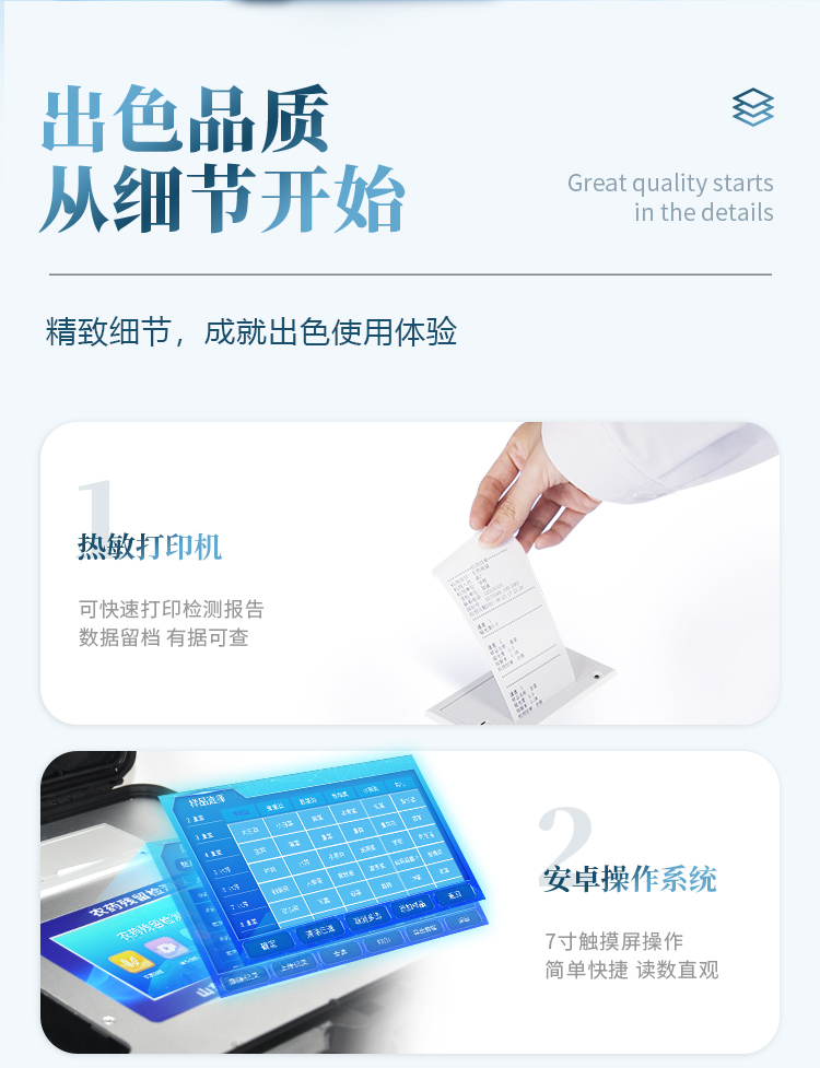 1、安卓智能操作系統,采用更加**和人性化操作,儀器具有無線聯網上傳功能,快速上傳數據,進行數據統計和分析。