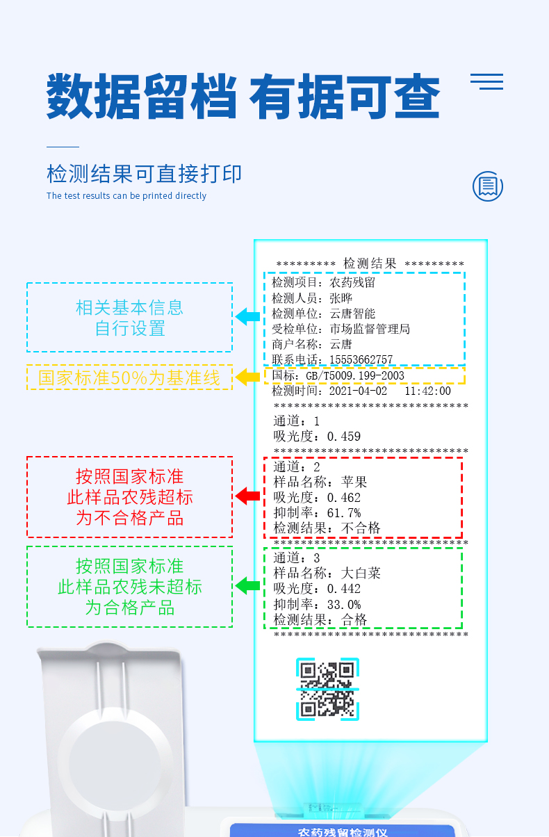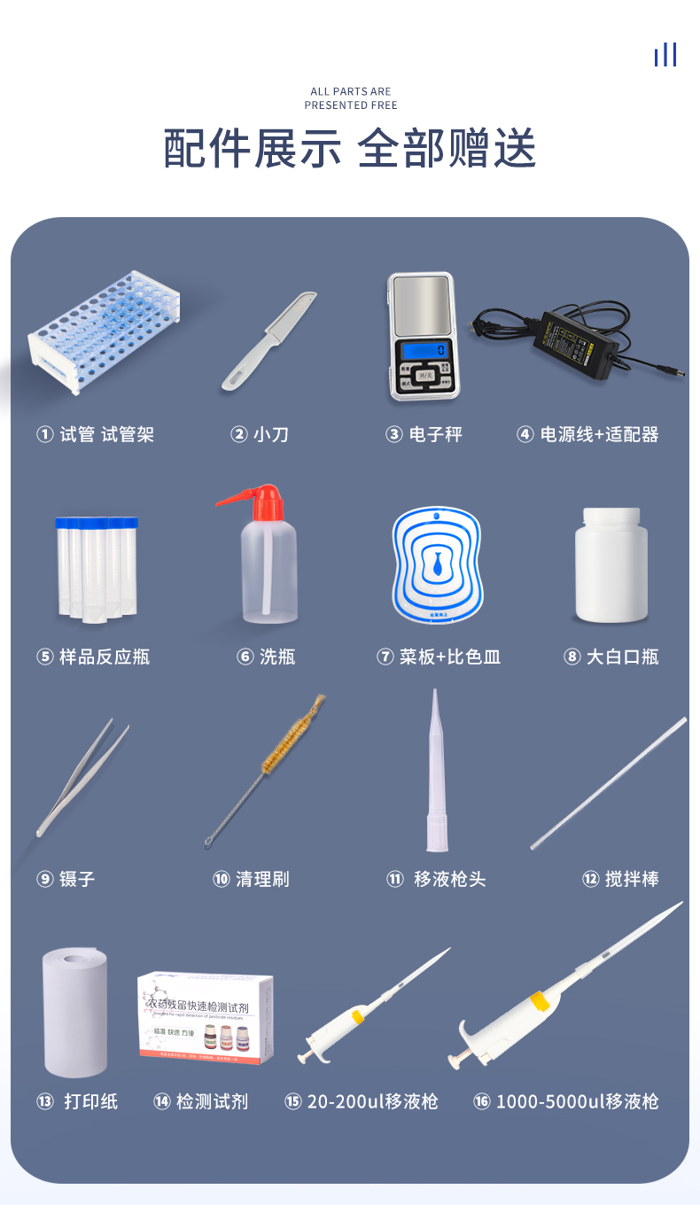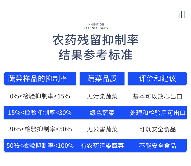 檢測標(biāo)準(zhǔn):依據(jù)國家標(biāo)準(zhǔn)方法(GB/T5009.199-2003)以及世界衛(wèi)生組織WHO、世界糧農(nóng)組織FAO殘留農(nóng)藥檢測標(biāo)準(zhǔn)、世界環(huán)境保護(hù)局EPA參照攝入量等要求來設(shè)計。采用酶抑制率比色法對水果、蔬菜等農(nóng)林產(chǎn)品中有機(jī)磷和氨基甲酸酯類農(nóng)藥含量進(jìn)行快速準(zhǔn)確的檢測。