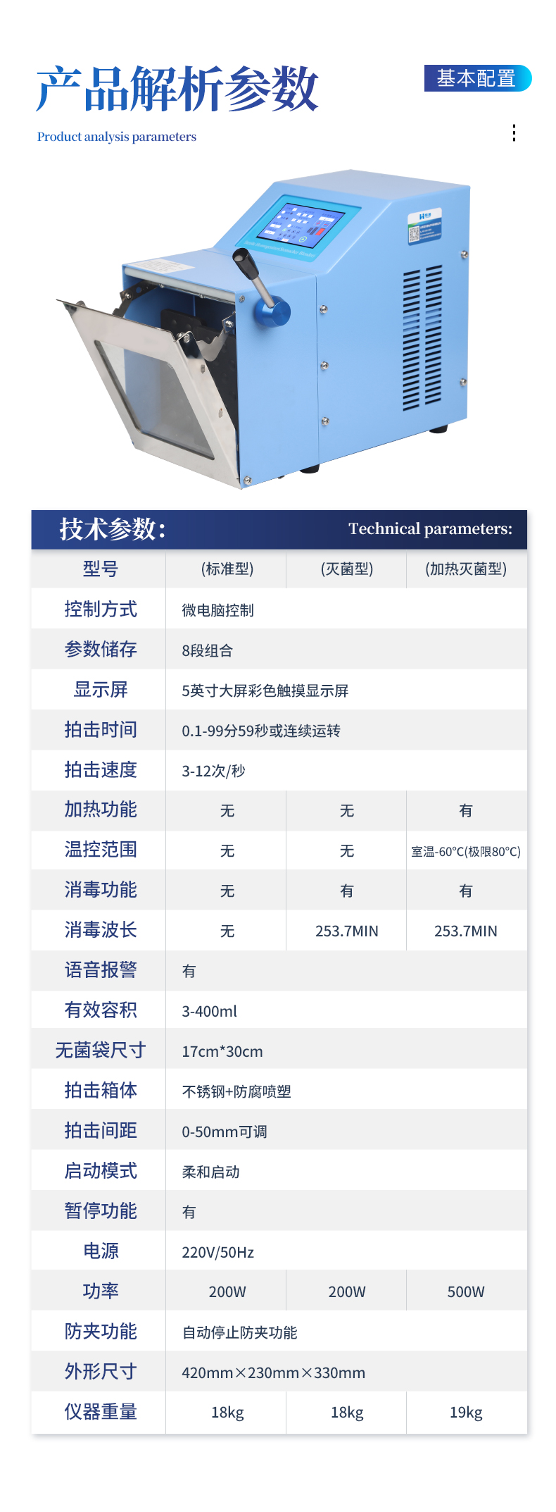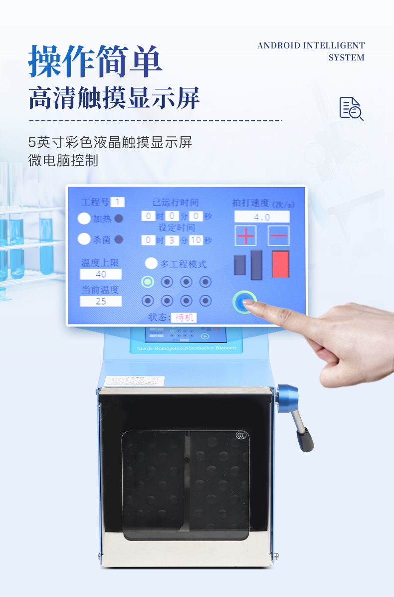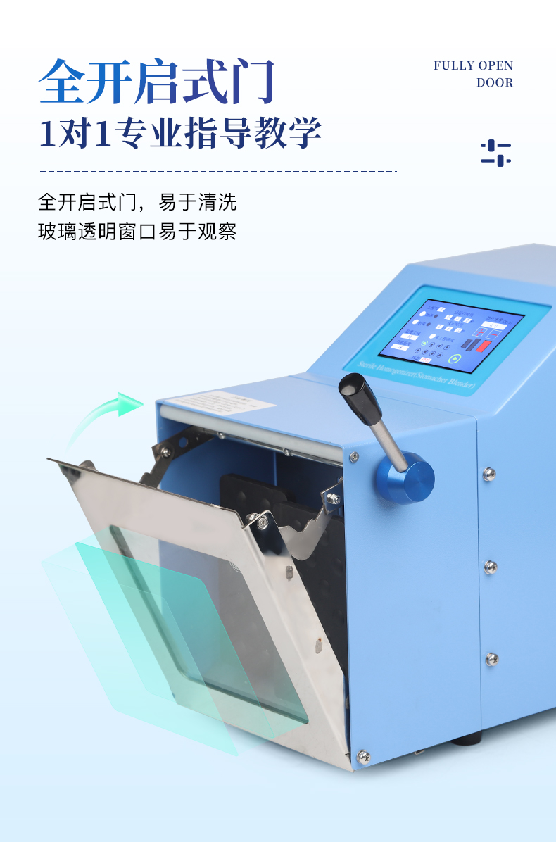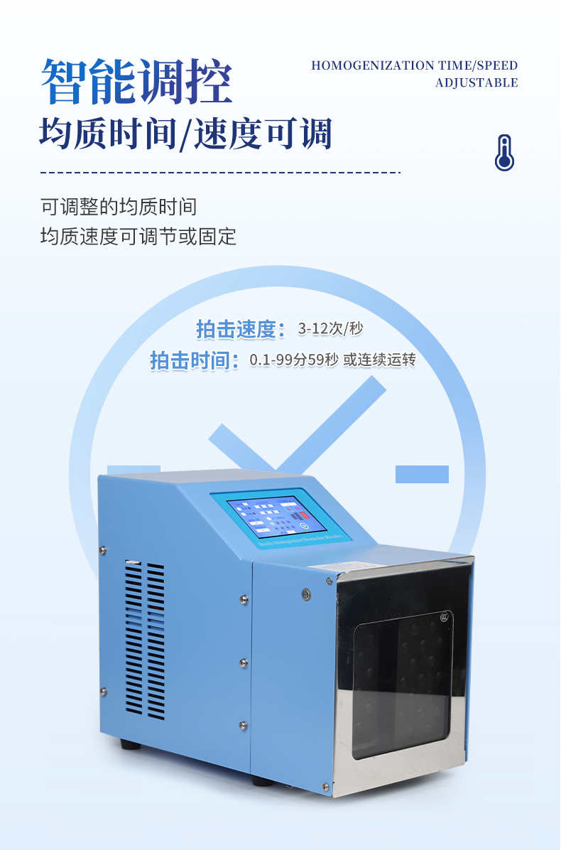 ●5英寸液晶顯示屏。 ●可儲(chǔ)存三組工作程序。 ●可調(diào)整的均質(zhì)時(shí)間。 ●均質(zhì)速度可調(diào)節(jié)或固定。 ●拍擊器可調(diào)整前后距離。 ●無(wú)菌一次性濾袋,保證衛(wèi)生。 ●全開(kāi)啟式門(mén),易于清洗。 ●玻璃透明窗口易于觀察 。 ●樣品與均質(zhì)儀無(wú)接觸,如無(wú)樣品泄露則不需進(jìn)行系統(tǒng)清洗. ●均質(zhì)柔和、樣品零污染、無(wú)損傷、不升溫、不需要滅菌處理,不需洗刷器皿。