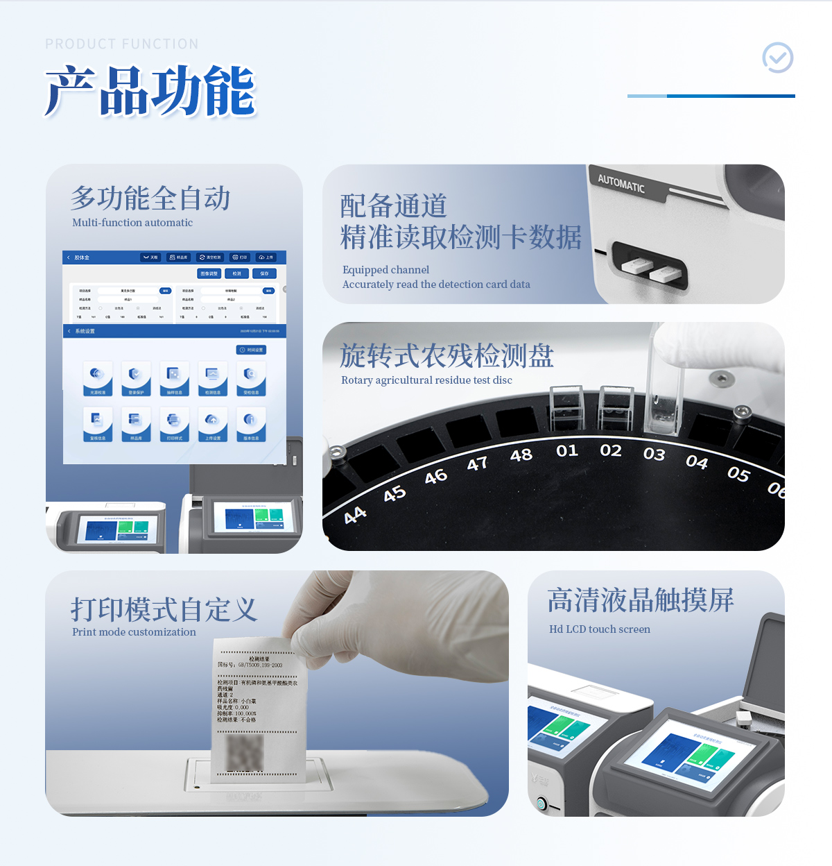 | 1. 試劑位置:3個 | 2. 農殘檢測盤:旋轉48通道比色盤,可任意選擇檢測通道,自動對應選擇通道。 | 3. 膠體金通道:6個單通道,1個三聯卡通道,可讀取檢測卡結果,自動采集、處理分析,自動判斷檢測結果,并具備自動判空功能。 | 4.系統配置:10.1寸高清液晶觸摸屏,采用ARM Cortex-A7,RK3288/4核處理器,運行內存1GB。Android7.1.1 系統分辨率1280×800。 | 5.恒溫系統:具有自動加溫溫控系統,精準恒溫37℃,精度±0.1℃。 | 6.添加系統:儀器按照試劑要求自動、按時、按量加入試劑,并且自動對未正常放置的樣本或異常的樣本進行檢查并提示。 | 7.清洗功能:儀器具備回流及自動清洗管路功能,避免試劑污染。 | 8.混勻功能:設備具備自動混勻功能。 | 9.光源校準:設備可自動校準,確保檢測準確度。 | 10.實時監控:儀器測試過程中屏幕顯示運行狀態,可實時查看。 | 11.數據存儲:內部存儲16GB,可存儲500萬條數據。 | 12.樣品多選功能:設備具備樣品一鍵多選功能,選擇樣品自動匹配檢測通道。 | 13.項目預設:可提前設置單個及多個相同或不相同的檢測任務,可單次或者多次調取,減少檢測時間。 | 14.自定義打印系統:內置自定義打印系統,可按需靈活設置開啟或關閉:產品合格證(國家農業部標準),二維碼,抽樣信息、檢測信息,受檢信息等信息的打印。 | 15.A4版本報告打印功能:設備可自動生成A4版報告,A4報告帶二維碼,可掃描二維碼生成電子版,并可識別真偽。 | 16.傳輸方式:儀器配備無線通信模塊: 4G(APN)通訊模塊、Wifi模塊,藍牙傳輸模塊,同時具有USB接口以及RJ45接口能以多種方式實現數據保存和數據傳輸功能,設備數據可以同步上傳至平臺。 | 17.數據監管系統:設備自帶監管平臺,并可同步對接監管平臺,數據可局域網和互聯網數據上傳,檢測結果可直接傳至食品安全監管平臺。達到食品安全問題預估、預警。 | 18.系統遠程更新功能:無需設備返廠,即可遠程實時升級全新系統,節省時間成本及避免運輸造成設備損。 |