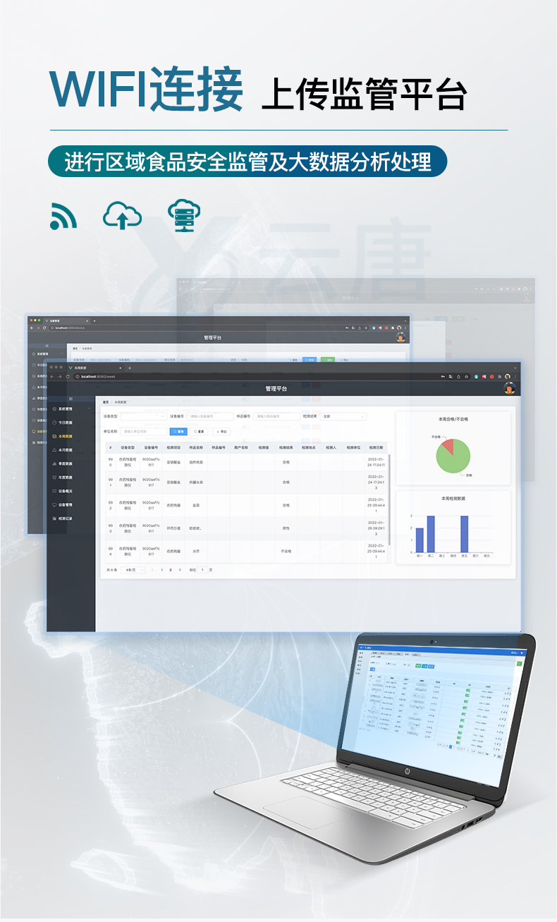 9.6、數據監管系統:同步對接監管平臺,數據可局域網和互聯網數據上傳,檢測結果可直接傳至食品安全監管平臺。進行區域食品安全監管及大數據分析處理與數據統計,監測區域食品安全長短期動態及問題預估、預警。