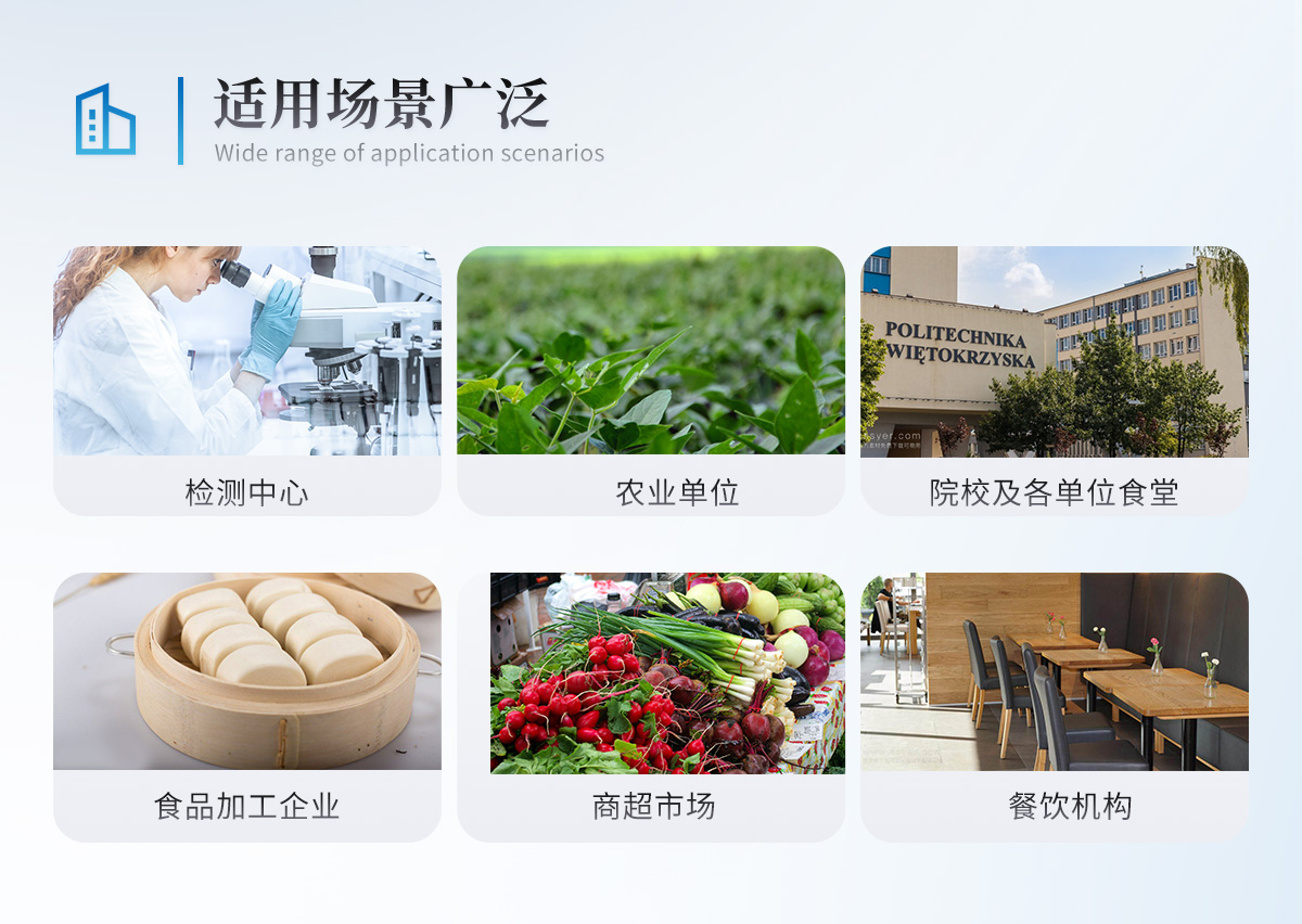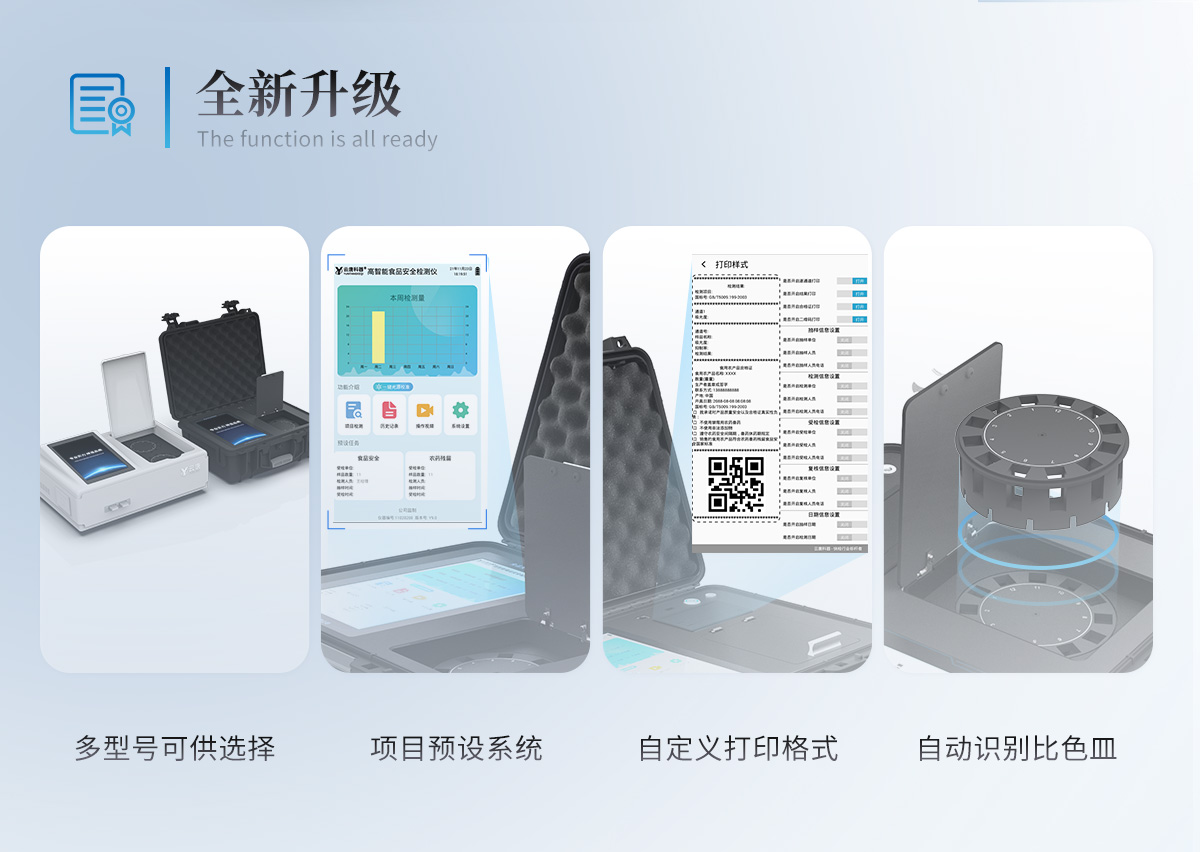 1、儀器采用手提式一體化系統(tǒng)檢測技術,將分光光度模塊、膠體金檢測模塊、新型農(nóng)殘檢測模塊、數(shù)字化管理模塊、無線通訊模塊高度集成于一體,支持檢測200種食品安全檢測項目,同時預留升級檢測方法。