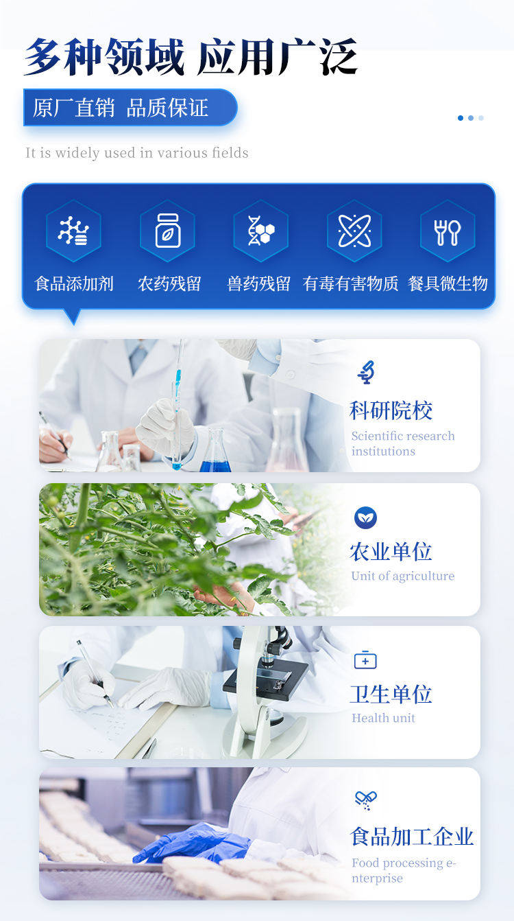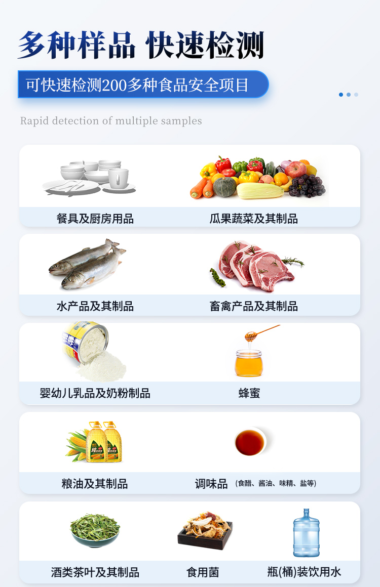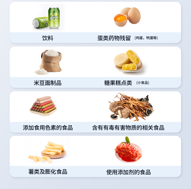 2. 檢測樣品種類:餐具及廚房用品、瓜果蔬菜及其制品、水產品及其制品、畜禽產品及其制品、嬰幼兒乳品及奶粉制品、蜂蜜、糧油及其制品、調味品(食醋、醬油、味精、鹽等)、酒類茶葉及其制品、食用菌、飲料、蛋類藥物殘留(雞蛋,鴨蛋等)、米豆面制品、糖果糕點類(小食品)、薯類及膨化食品、瓶(桶)裝飲用水、添加食用色素的食品、使用添加劑的食品、含有有毒有害物質的相關食品。