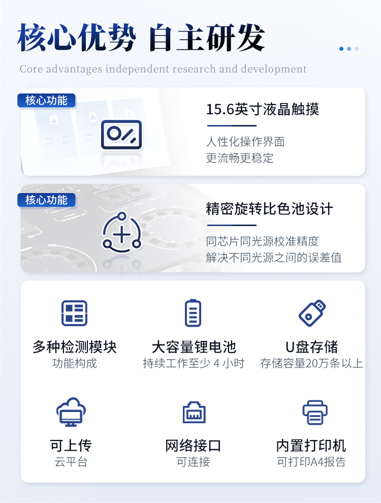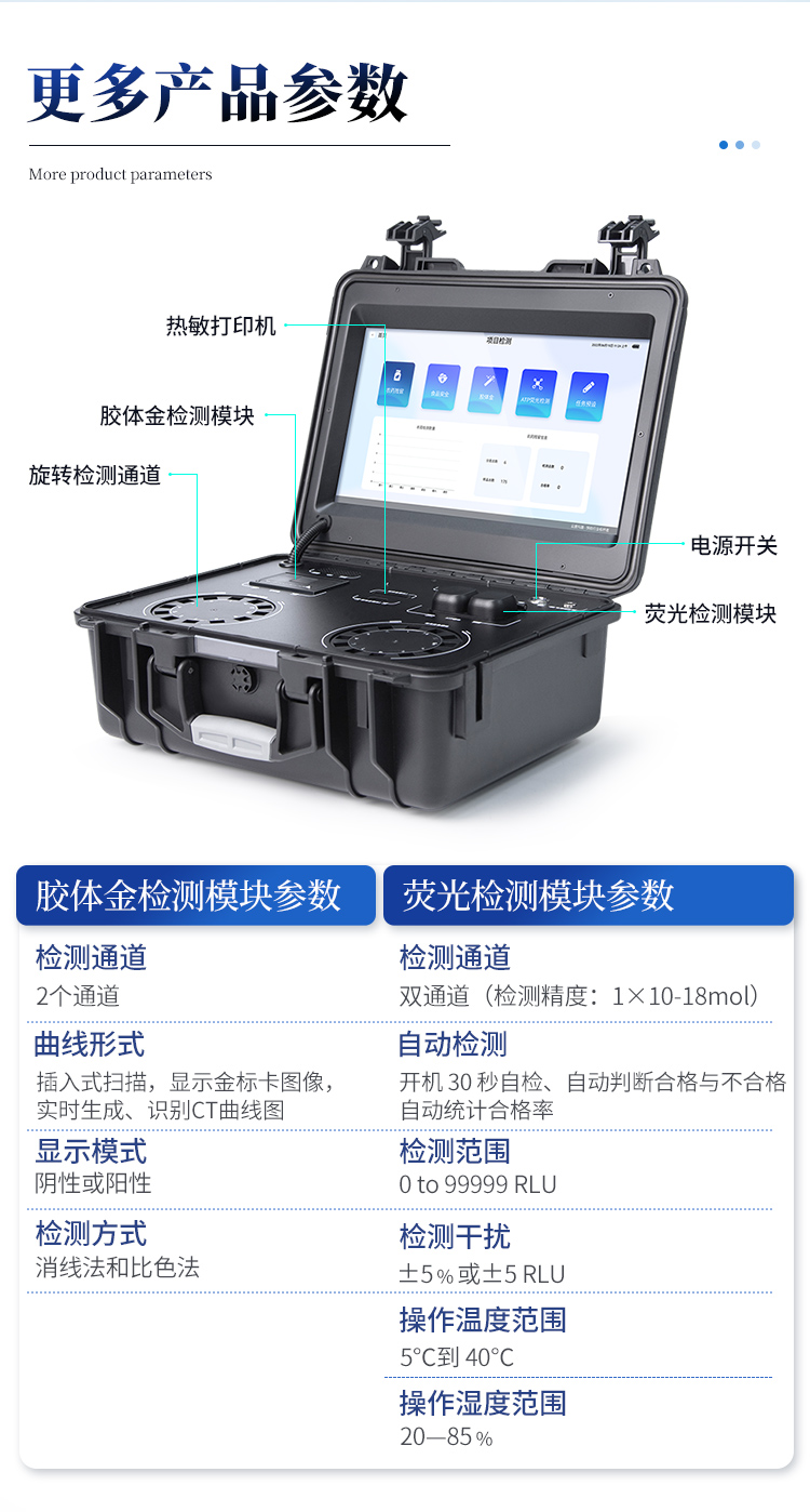 1. 功能構成:主要包括分光光度模塊、新型農殘檢測模塊、膠體金檢測模塊、熒光檢測模塊、數字化管理模塊等,所有模塊集成一體,可快速檢測200多種食品安全項目,如獸藥殘留、農藥殘留、非法添加劑、細菌數值等指標。