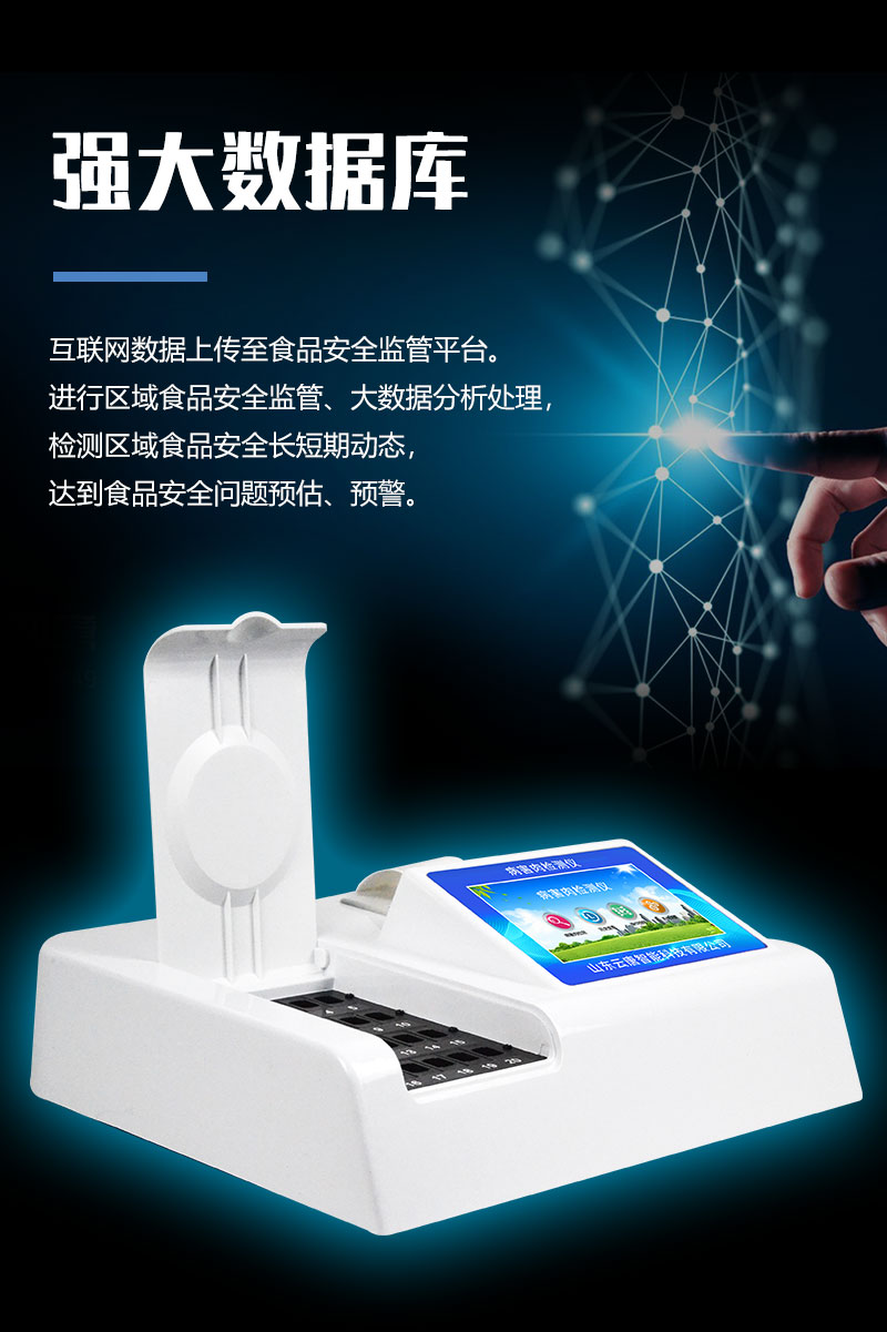 8、儀器帶有監管平臺。數據可局域網和互聯網數據上傳,檢測結果直接傳至食品安全監管平臺。進行區域食品安全監管及大數據分析處理,檢測區域食品安全長短期動態,達到食品安全問題預估、預警