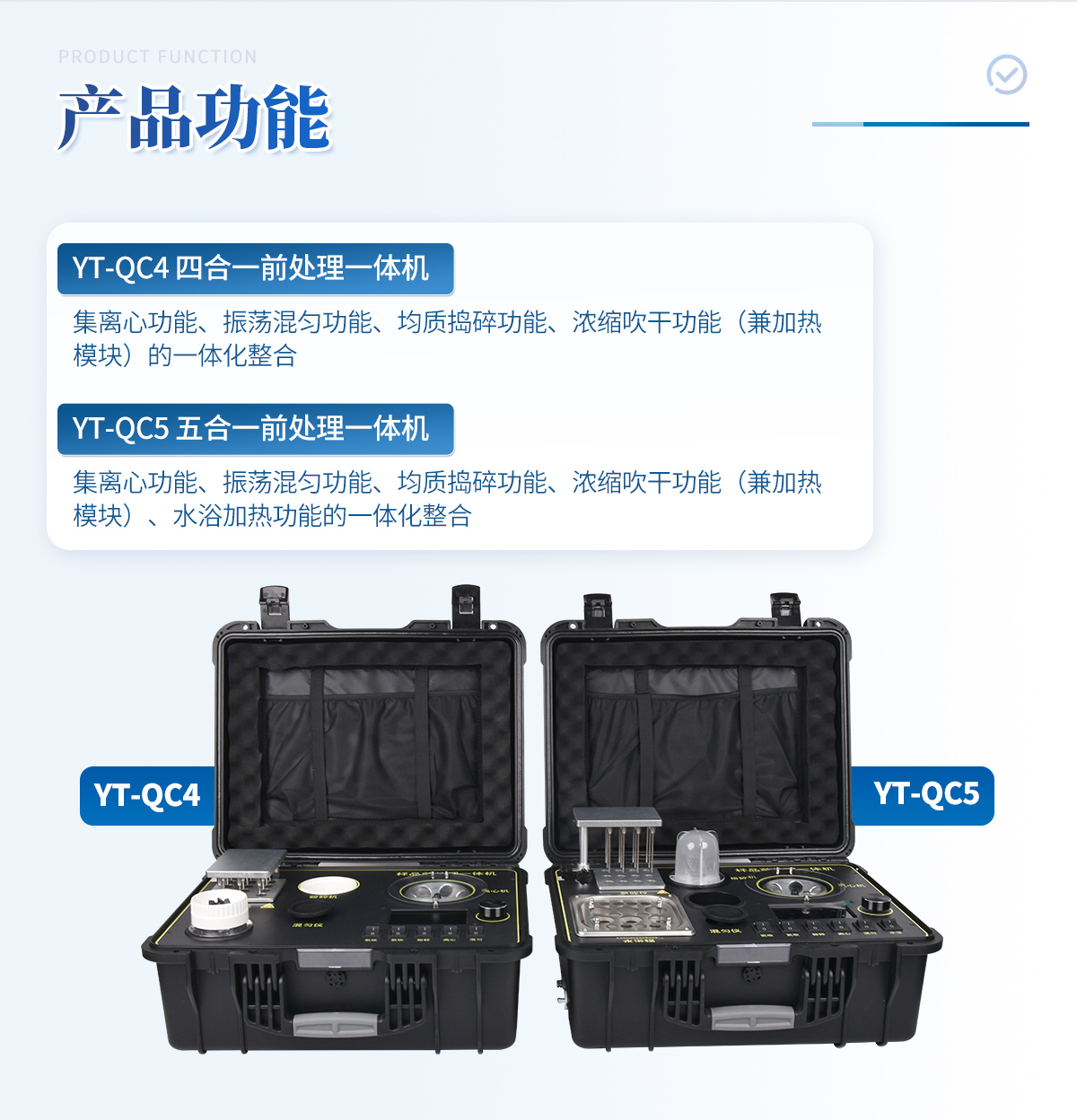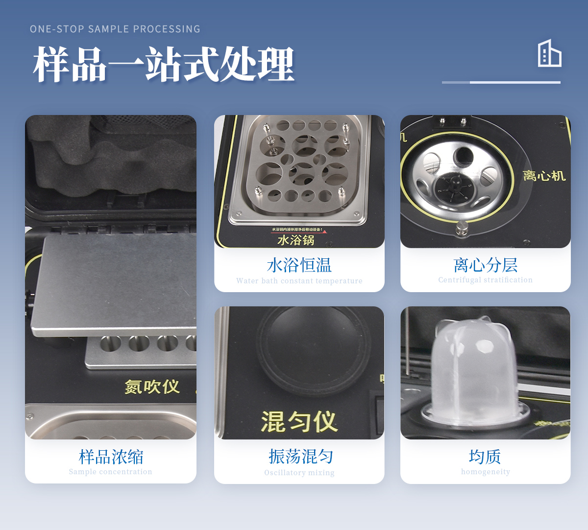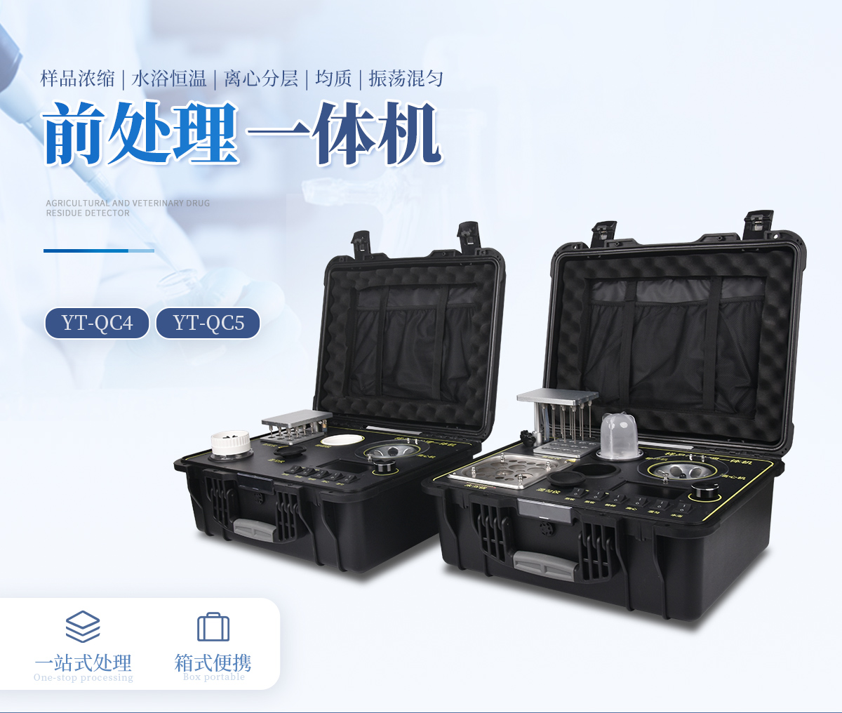 應(yīng)國內(nèi)用戶的實(shí)際需求,自行研制開發(fā)的新型儀器——QC05型樣品前處理一體機(jī)。樣品前處理集成箱將樣本前處理過程中樣品濃縮、水浴恒溫、離心分層、均質(zhì)、振蕩混勻等步驟所需設(shè)備進(jìn)行集成,僅需一臺樣品前處理集成箱設(shè)備即可完成所有樣本前處理過程,并且方便攜帶,不僅適用于現(xiàn)場檢測使用,還可用于色譜、質(zhì)譜等分析樣品的純化和制備。