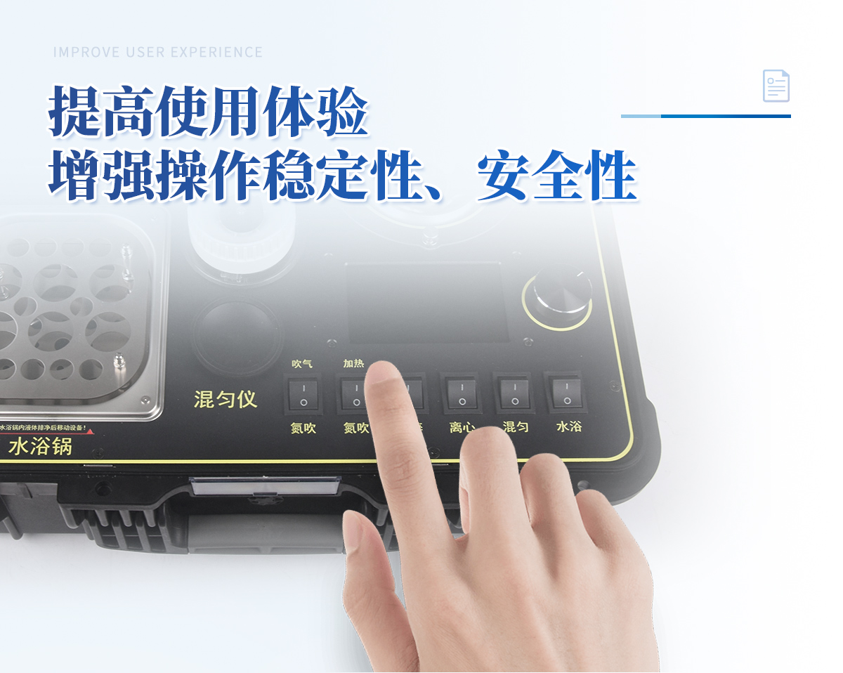 1、功能緊湊,集成五種樣品前處理常用的功能,完成樣品一站式處理。2、結(jié)構(gòu)穩(wěn)固,機(jī)箱采用***工程塑料,具備**的抗沖擊性、耐腐蝕性、便攜性。3、操作穩(wěn)定,機(jī)器采用五寸全彩色液晶屏,功能指示性強(qiáng),用戶操作均為實(shí)體開關(guān),杜絕佩戴手套和液體噴濺時的操作失效。