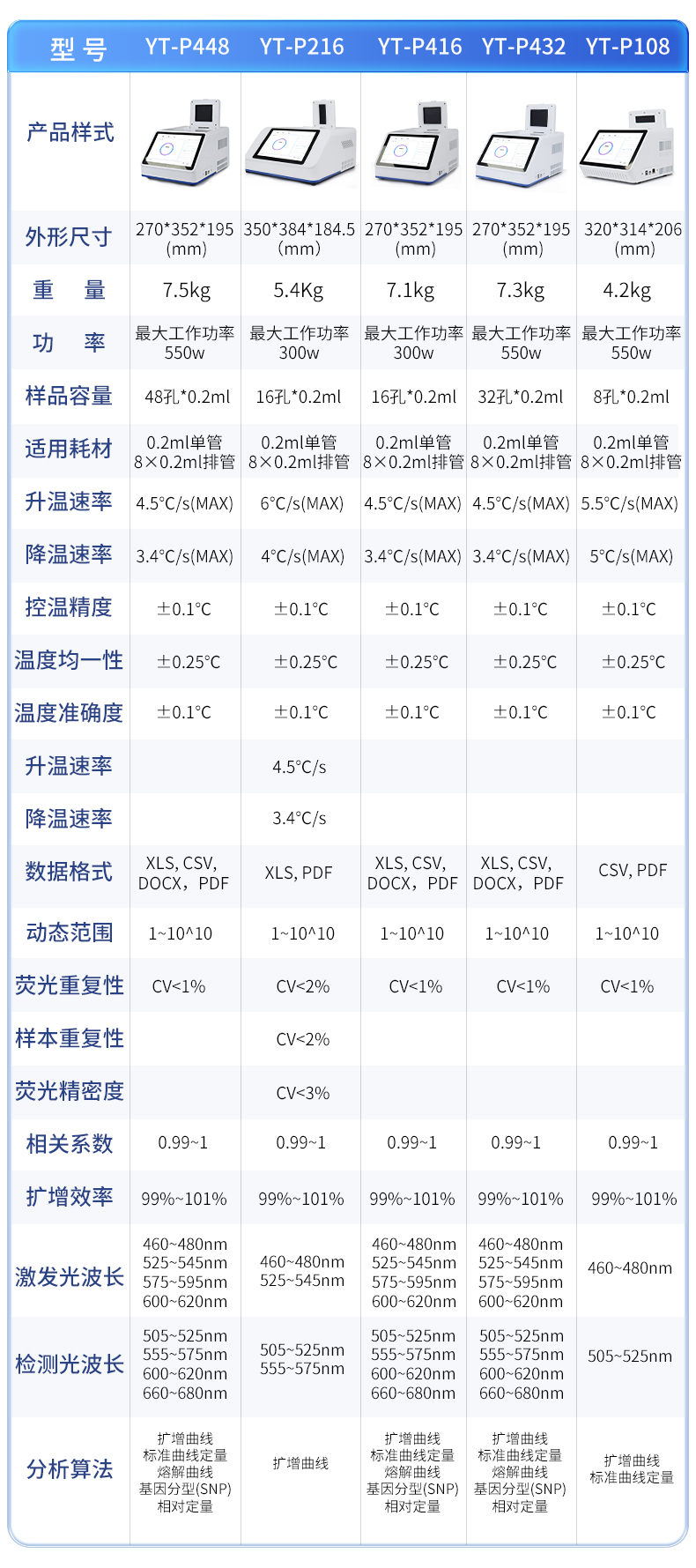 | 1.智能操作系統,實驗盡在掌握 | A程序更新與預設:支持在線更新實驗程序,并內置豐富的預設實驗程序模板,用戶亦可自定義保存常用模版,實現一鍵快速啟動,極大提升操作效率。 | B操作簡單:無論是觸摸屏界面還是電腦軟件,均設計得直觀易懂,新用戶也能快速上手。預置常用程序模板,進一步簡化操作流程。 | 2.精準穩定的溫控與光學核心 | A長久精準的溫控系統:采用進口***TEC半導體制冷模塊,控溫精準(±0.1°C),孔間溫度均勻性**(≤±0.3°C)。系統穩定性卓越,長期使用性能衰減小,校準周期長達數年,顯著降低維護成本與運營中斷。 | B免維護的靈敏光學系統:配備單個獨立LED光源與單個獨立光電二極管檢測器,采用超長壽命進口光源,設計壽命期內免維護,無需額外校準或更換,保障檢測結果長期一致性與高靈敏度。 | C卓越的數據質量:實驗線性相關性高(R2≥0.999),重復性優異(孔間CV值低),確保定量結果準確可靠,數據置信度高。 | 3.**便捷的數據與輸出管理 | A多重數據導出方式:支持通過USB存儲設備直接拷貝,或經由Wi-Fi無線網絡傳輸數據至本地服務器或云端,方便靈活,滿足各類實驗室數據管理習慣。 | B豐富的報告導出與打印:支持生成并導出多種格式(如PDF、Excel)的實驗報告。儀器兼容USB熱敏打印機、藍牙無線打印機及常規A4打印機,可直接在儀器上或通過電腦一鍵導出并打印專業報告,便于結果存檔與即時分享。 | 4.快速**與堅固耐用 | A升降溫速度快:優化設計的溫控系統具備高速升降溫能力,顯著縮短單次循環與整體檢測時間,提升實驗通量。 | B超長使用壽命:核心部件均選用工業級耐用材料與設計,整機運行穩定可靠,致力于為用戶提供長久的投資回報。 |